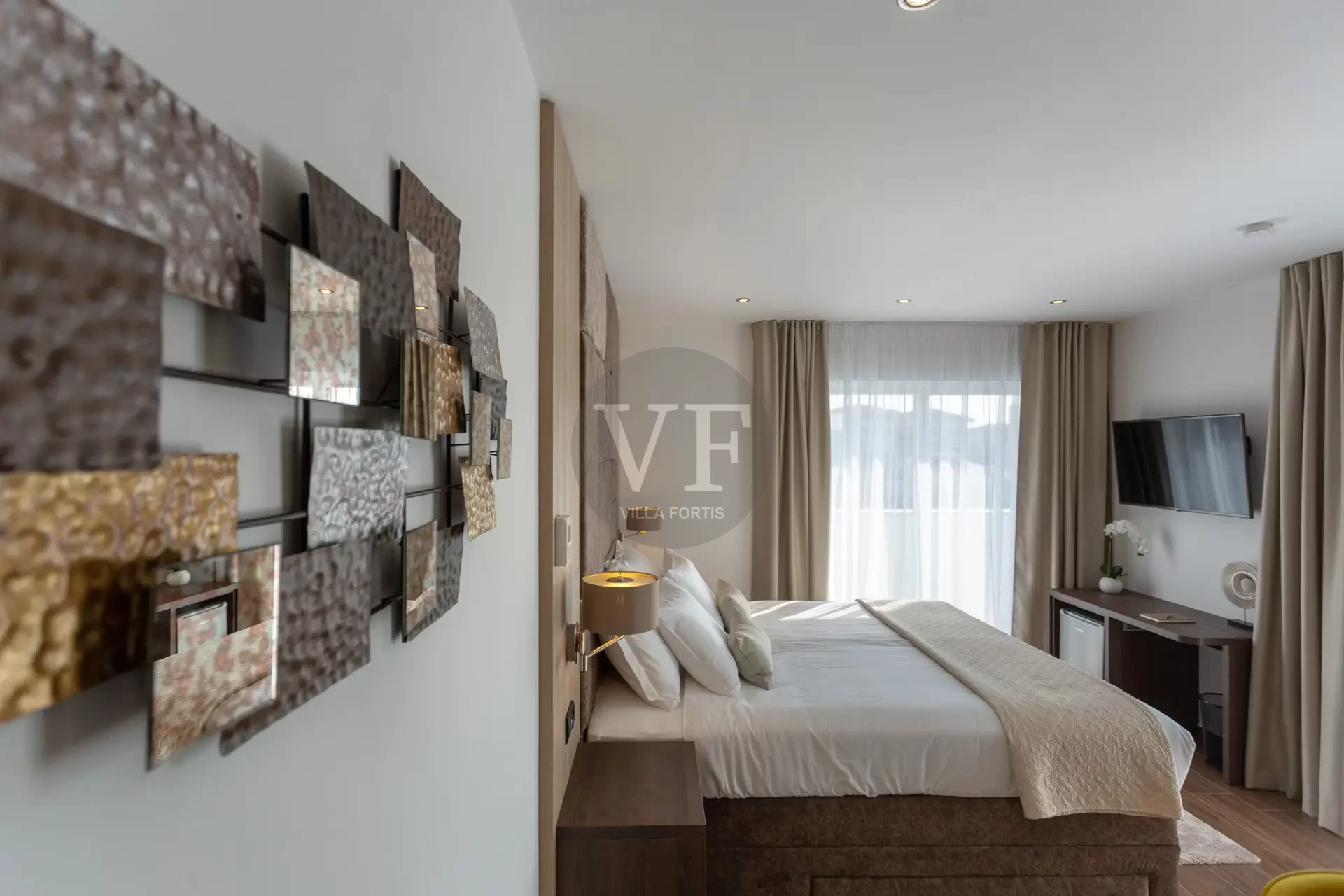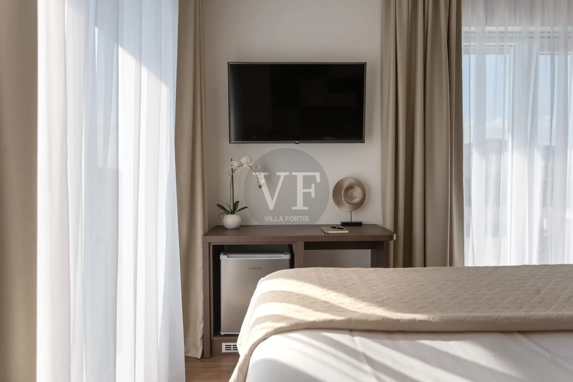 Deluxe room is situated on the first floor. It’s larger than Standard room, featuring balcony with sun bed, sea view, king size bed…